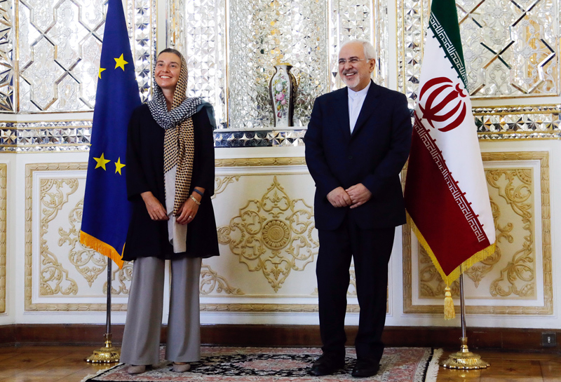 The behavior of European leaders towards Iranian Foreign Minister Mohammad Javad Zarif during his visit illustrates how frightened they are of the Iranian regime and how these non-stop moralists will seemingly do anything for money. Pictured: The EU’s chief diplomat, Federica Mogherini (left), poses with Zarif during her August 2017 visit to Iran. (Image source: European External Action Service/Flickr)